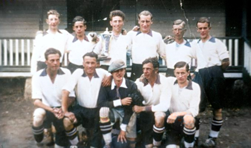 1930-tal. Boxholms bollklubb framför omklädningspaviljongen på Ekebergs idrottsplats. AI-kolorerad. Bakre raden fr.v: Hugo Andersson, Seth Ekedahl, Aston Hjärtkvist, Gösta Karlsson, Sten Boman, Valdemar Jansson.