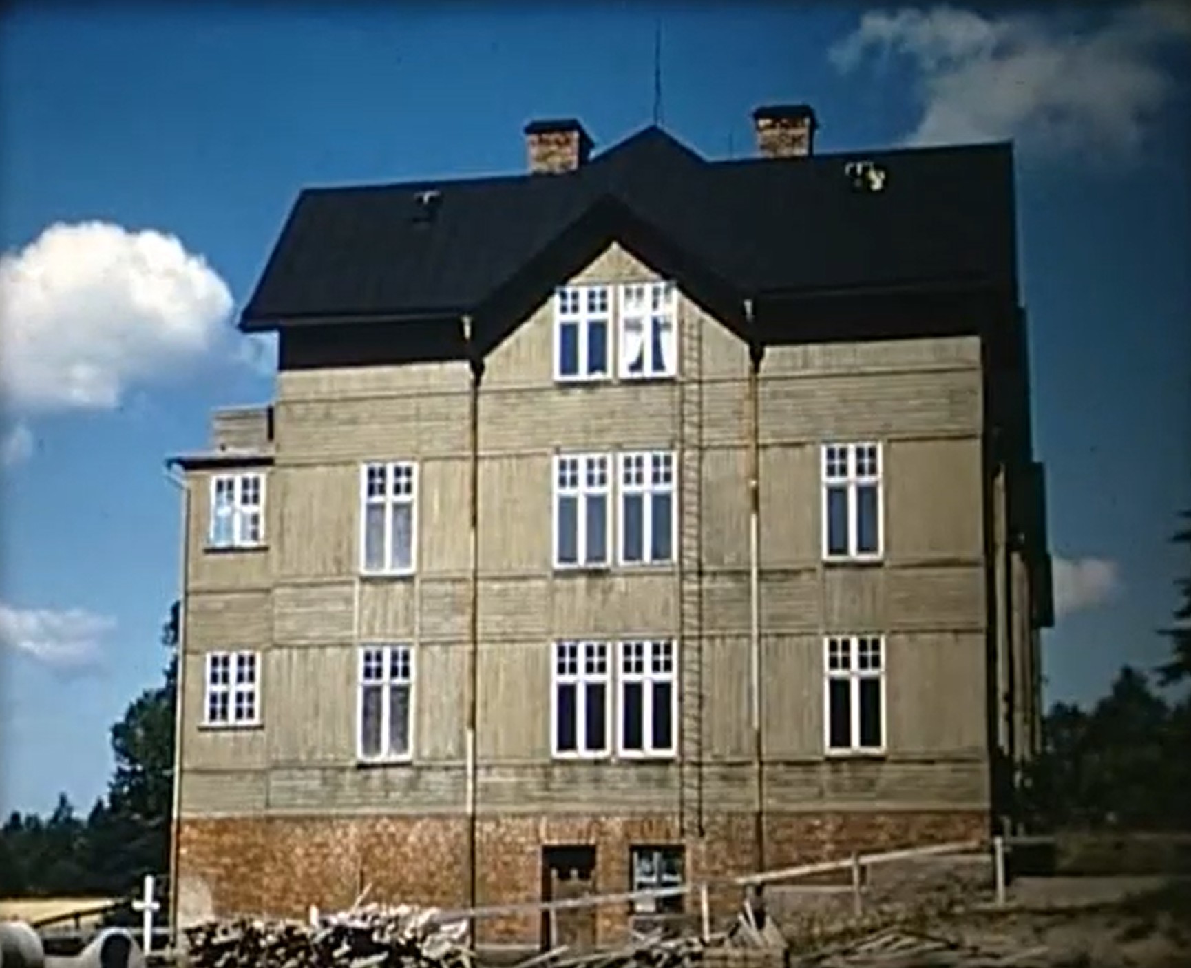 Lärarbostäderna från Skolgatan. Tidpunkten är precis före byggnadernas rivning i början av 1960-talet från en film dokumenterande detta.