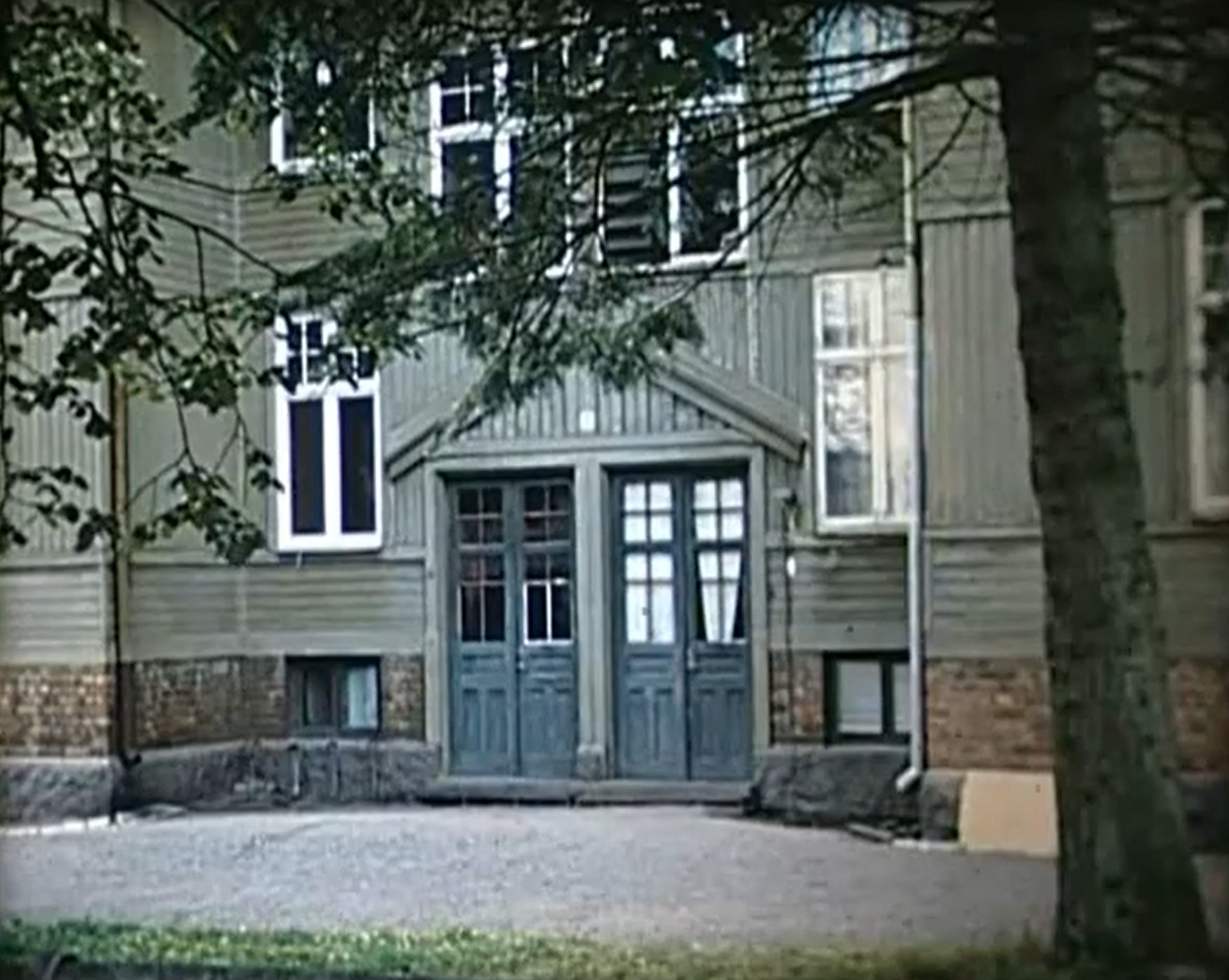 Lärarbostädernas entré från Skolgatan. Tidpunkten är precis före byggnadens rivning i början av 1960-talet från en film dokumenterande detta.