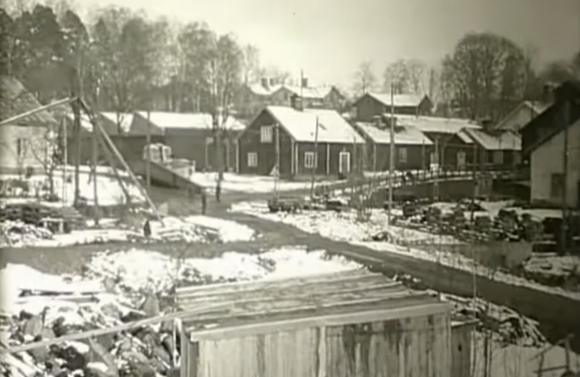 Modellförrådet syns här bakom Askerbomsbyggnaden. Från en film om bygget av Bredgårdsverkets första etapp.