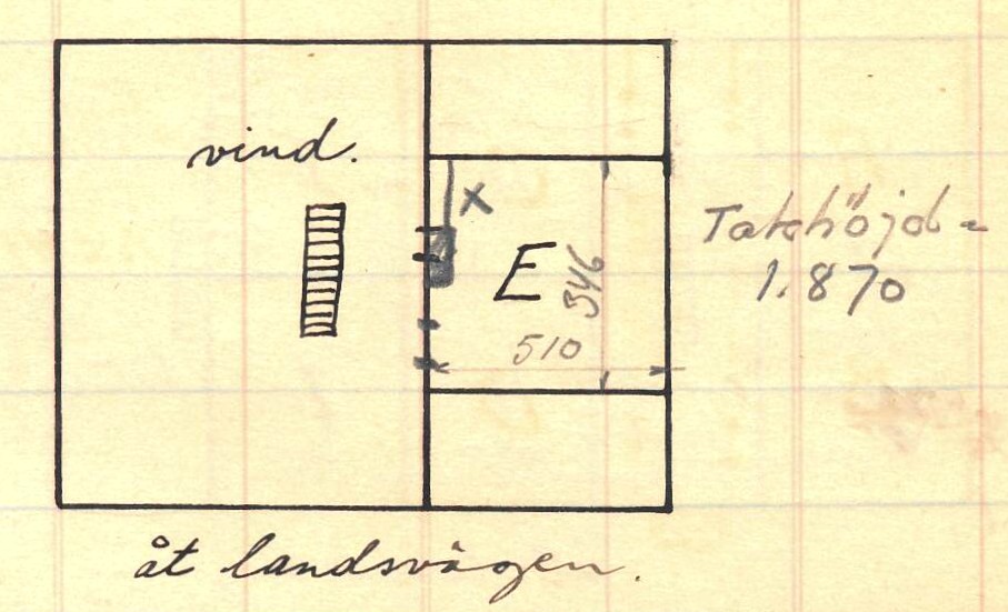 Från förtecking över fastighetsåtgärder 1910-1960. Plan 1. Bemärk husets framtida tillbyggnad till vänster.